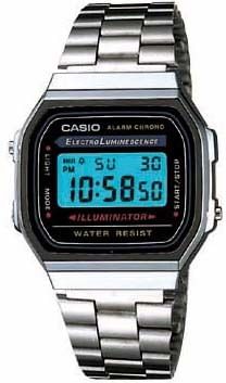Brand: Casio Style: A168W-1 Size: Mens Movement: Quartz Movement Crystal: Scratch-Resistan tSapphire Crystal Rated: Water Resistant Attachement: Stainless Steel Bracelet