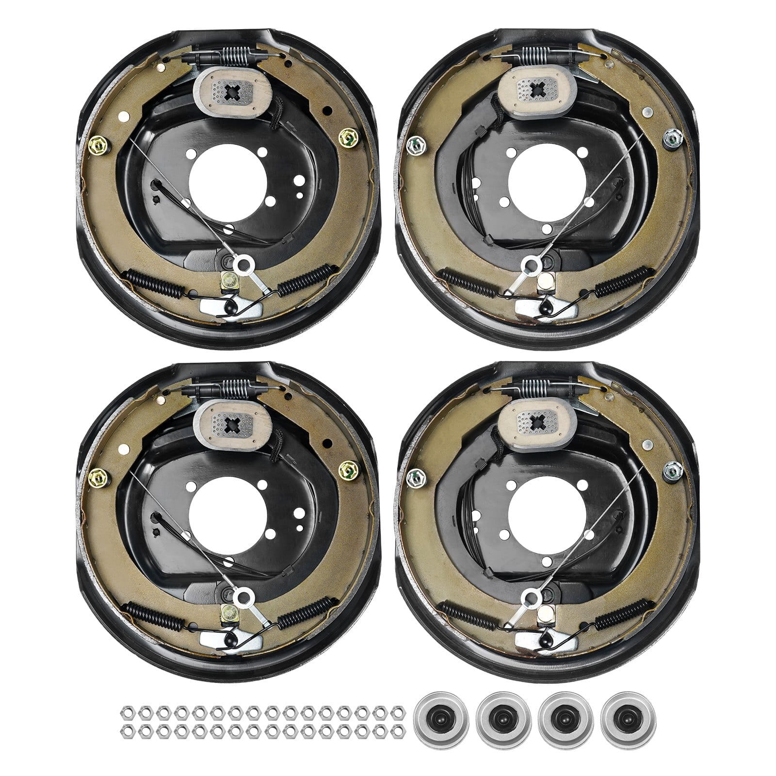 Set Includes: Two Sets (4 Brakes),Material: SPHC + Q235,Brake PadAdjustability: Self-Adjusting Feature,Magnetic Force:≥600N,Applicable Trailer Weight: 7000 lbs,Magnet Size: 12",FrictionCoefficient: 0.48,Brake Size: 12" x 2",Product Size: 13.82" x2.81",Flange Stud Count: 5,Item Model Number: BF12-Z02A*4,ProductWeight: 59.26 lbs,Lifespan: ≥30,000 km,Voltage/Current:DC12V/2.8-4.2A,Brake Pad Material: Asbestos-FreeSemi-Metallic,Brake Pad Size: 1.97" x 0.19"