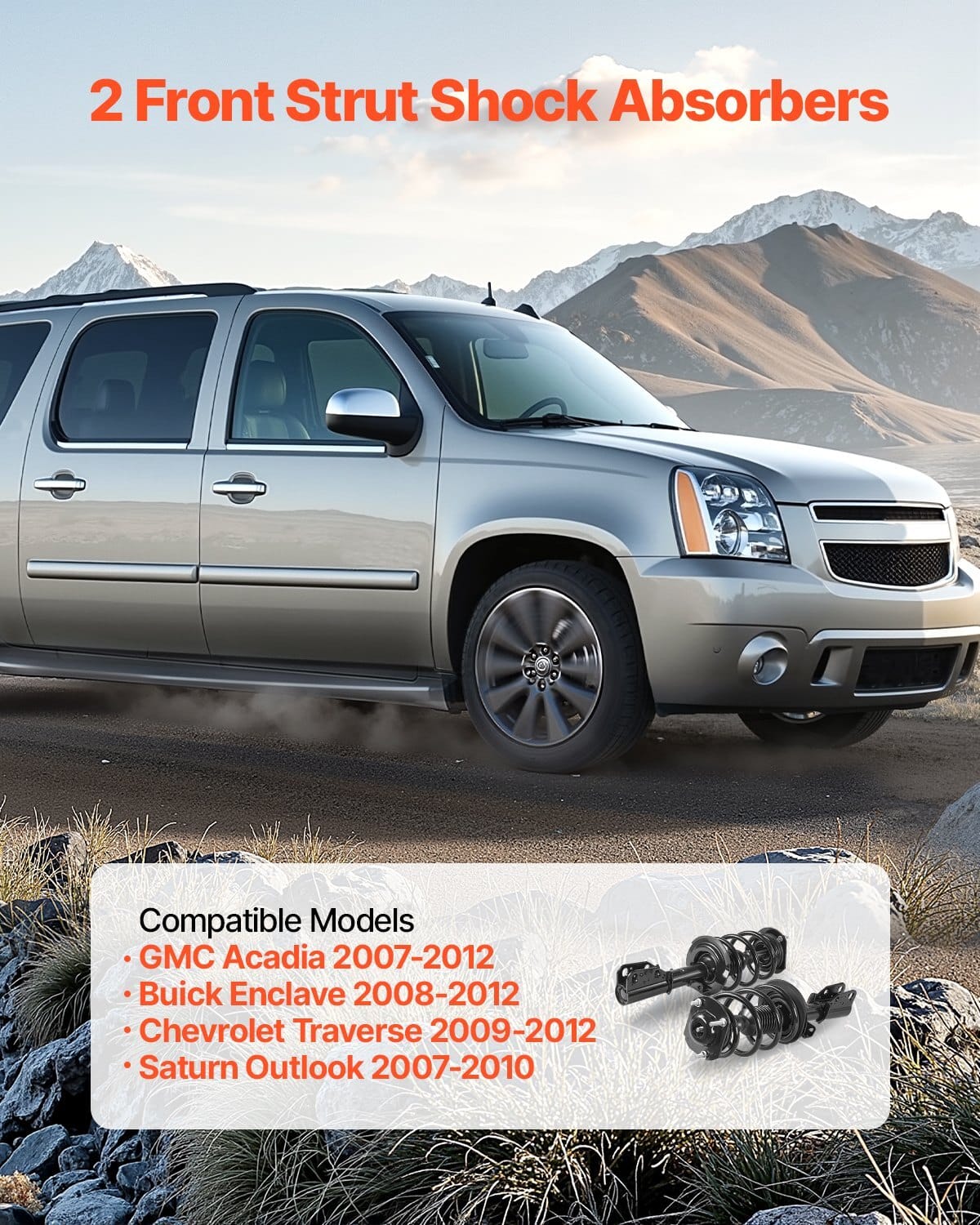 VEVOR Front Shock Absorber Strut Assembly, 2Pcs Shock and StrutAssembly with Coil Spring, Fit 2007-2012 GMC Acadia, 2008-2012Buick Enclave, 2009-2012 Chevrolet Traverse, Replace OE 11680 /172518 Core Component Vehicle Fitment Enhanced Comfort Built to Last Enhanced Safety Direct Installation Item Model Number: SSJ0012,Product Dimensions: 25.79 x 6.93 x 7.09in / 655 x 176 x 180 mm,Net Weight: 46.19 lbs / 20.95 kg
