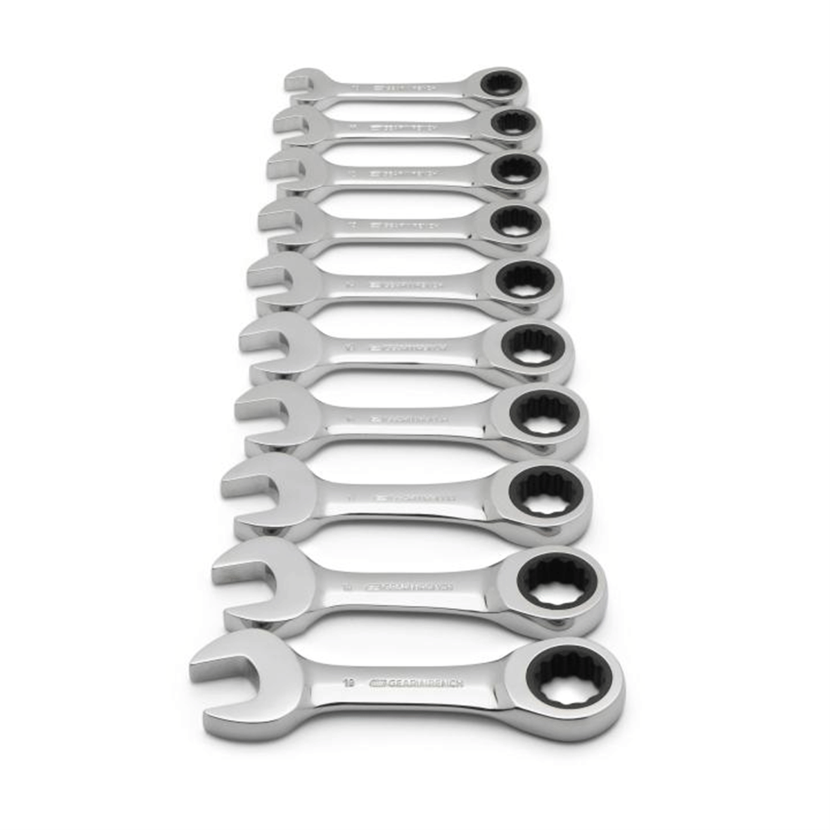 GearWrench 10 Piece 72-Tooth 12 Point Stubby Ratcheting Combination Metric Wrench Set72 tooth ratcheting box end needs a minimal 5° to move fasteners vs. 30° for standard wrenches;Flush mounted reversing lever allows you to change direction without removing the wrench;Off-corner loading design on box end provides better grip and reduces fastener rounding;15° offset offers increased clearance;Thin head and beam provide greater access in confined work areas Warranty: Call vendor for warranty