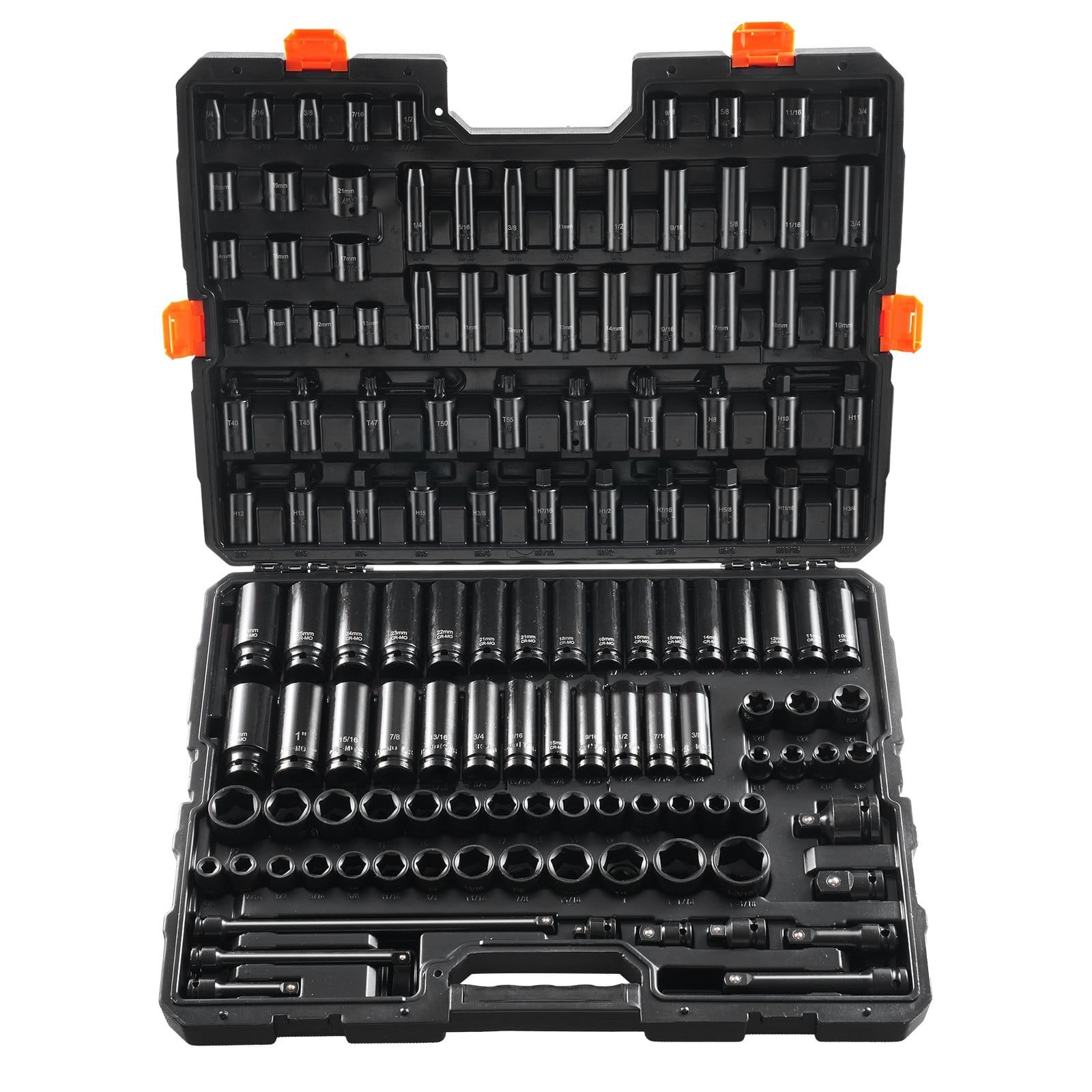 Impact Sockets Set: 130 PCS,Item Model Number: XL3069,Material:CR-MO Alloy Steel,Hardness: HRC42-48,Net Weight: 43.7 lbs / 19.86kg,Product Size: 20.8 x 16 x 3.5 in / 530 x 410 x 90 mm
