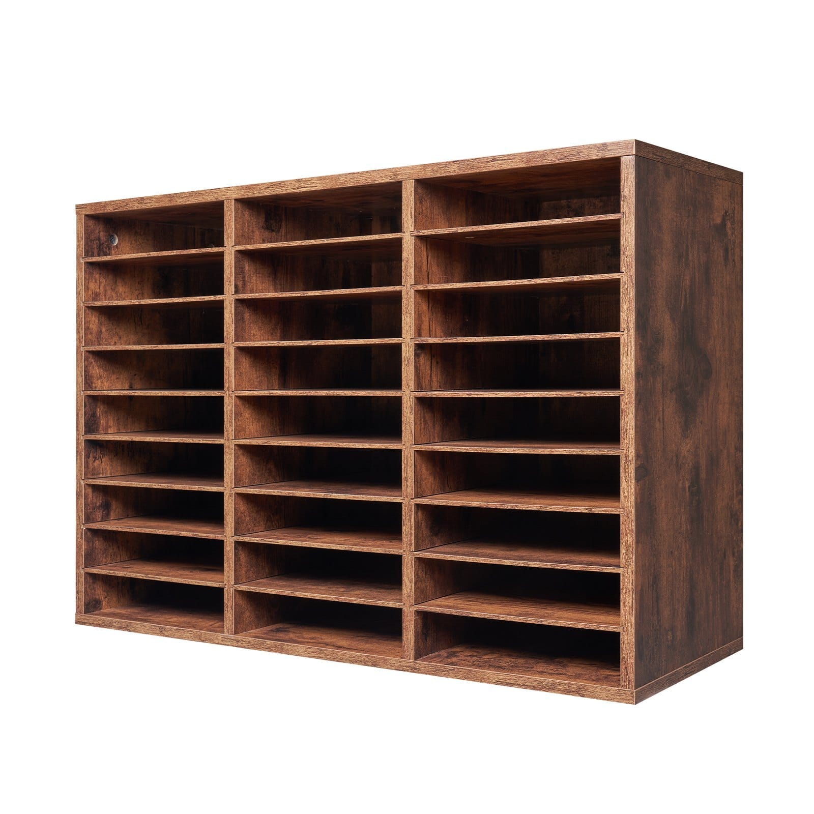 Number of Compartments: 3 Columns x 9 Rows = 27 Compartments,ShelfSpacing: Fixed at 2.1 in / 53 mm,Main Materials: VeneeredChipboard, MDF,Load Capacity: 4.4 lbs / 2 kg per Shelf,SupportBoard Thickness: 0.6 in / 15 mm,Back Panel Thickness: 0.1 in / 3mm,Color: Dark Brown,Item Model Number: HZFC008-BN,Shelf Thickness:0.2 in / 5 mm,Product Dimensions: 31.5 x 11.7 x 21.7 in / 800 x 297x 550 mm,Net Weight: 38.6 lbs / 17.5 kg