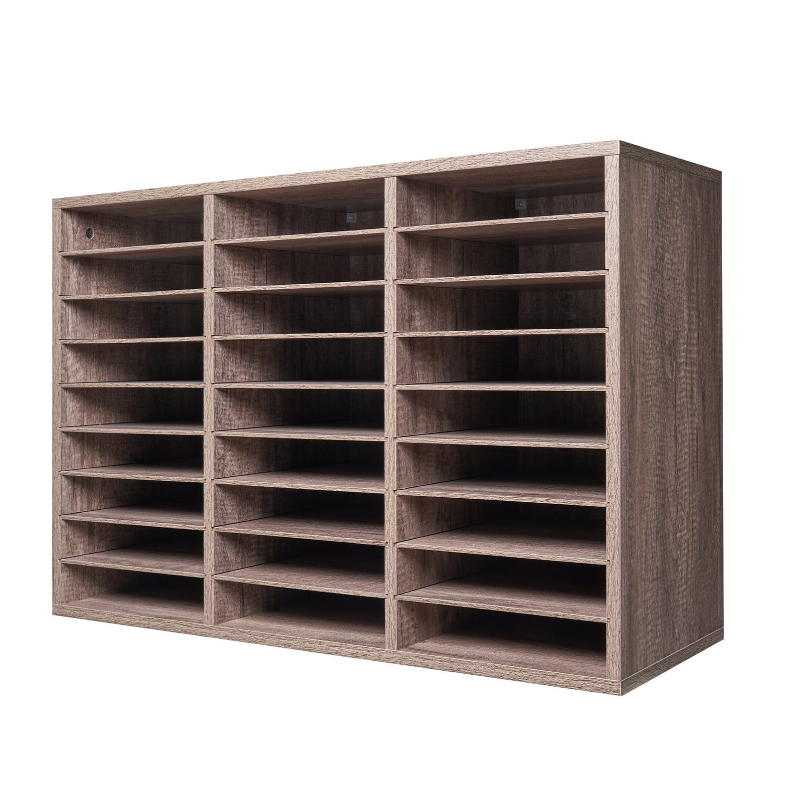 Number of Compartments: 3 Columns x 9 Rows = 27 Compartments,ShelfSpacing: 2.1 in / 53 mm,Main Materials: Veneered Chipboard,MDF,Load Capacity: 4.4 lbs / 2 kg per Shelf,Support BoardThickness: 0.6 in / 15 mm,Back Panel Thickness: 0.1 in / 3mm,Color: Black-Grey,Item Model Number: HZFC008-GY,Shelf Thickness:0.2 in / 5 mm,Product Dimensions: 31.5 x 11.7 x 21.7 in / 800 x 297x 550 mm,Net Weight: 38.6 lbs / 17.5 kg