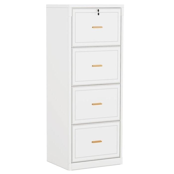 The slim, vertical design allows this 4 Storage Vertical Lockable File Cabinet to fit in any room, preserving floor space. With smart storage options, it easily holds your items while keeping your area tidy. With a White linen finish, this 51.2''H x 17.7''W x 22.8''L file cabinet includes four drawers, each with adjustable hanging rails perfect for storing letter/legal/A4/F4 size documents. Built with premium MDF for lasting durability, the filing cabinet is stable enough to support a printer or scanner. Extra safety is provided by anti-tip metal buckles for secure wall attachment. Metal ball bearing and full-extension drawer slides ensure your filing cabinet drawers won't stick or derail, for easy opening and closing. Metal handles on each drawer add to the ease of use. This classic-styled filing cabinet comes with all necessary hardware and instructions for swift assembly. Quality is guaranteed, and customer service is readily available for any queries.